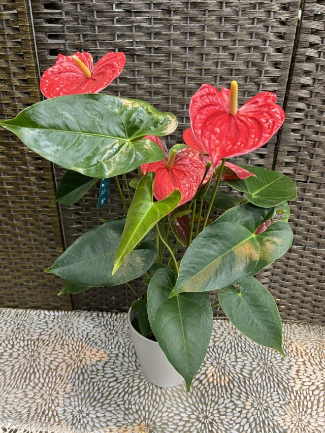 爽やかな葉のグリーンと、つややかな赤や白がとてもステキなアンスリウムです。